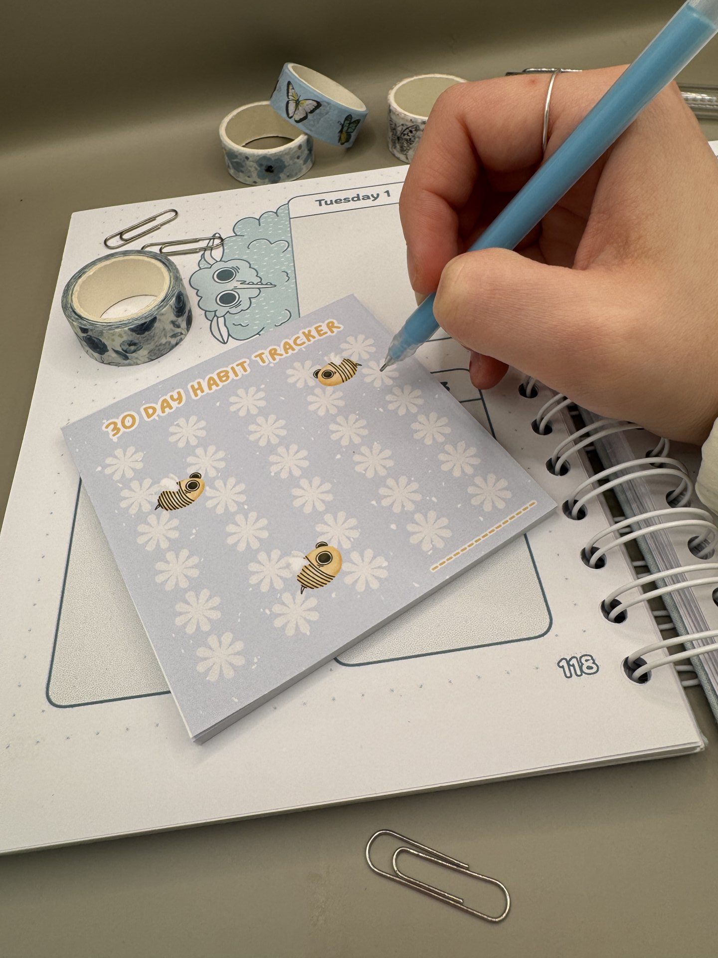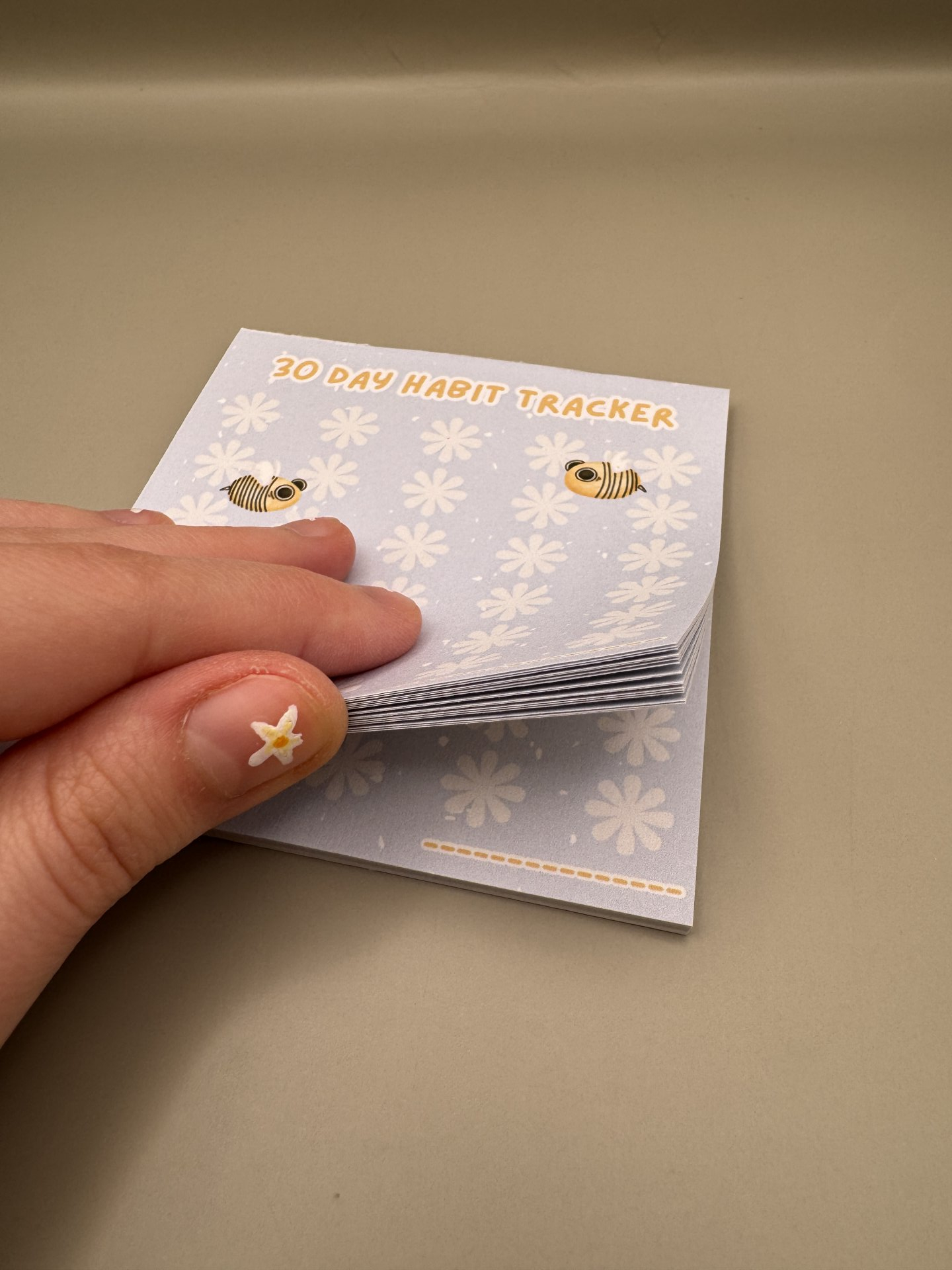 Handmade habit tracker notepad with bee and flowers design.