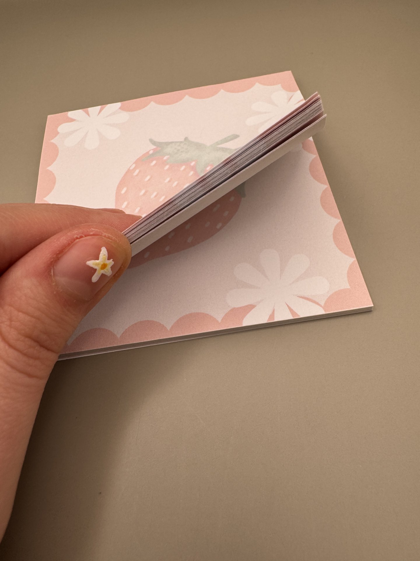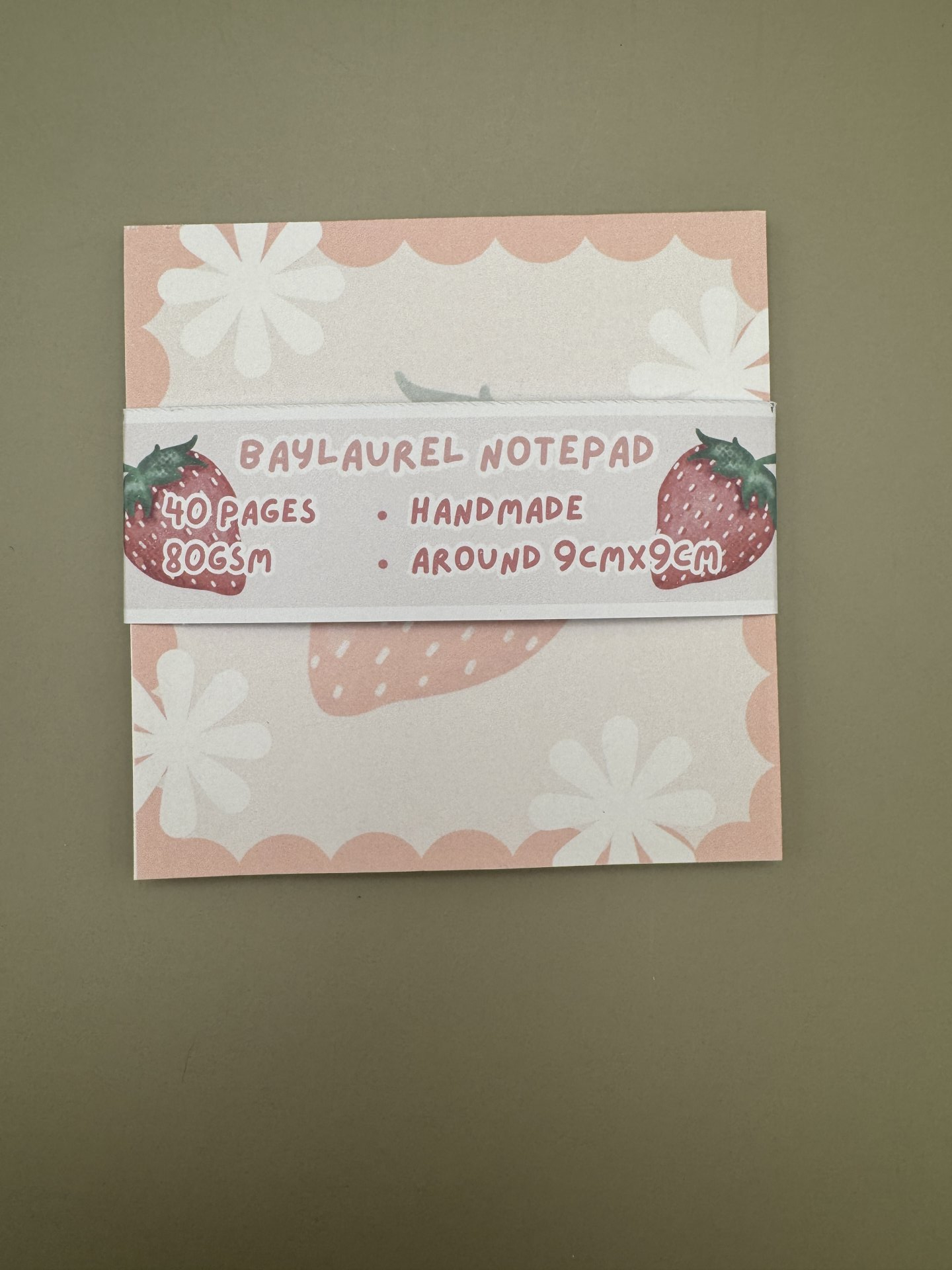 Handmade memo pad with big strawberry design.