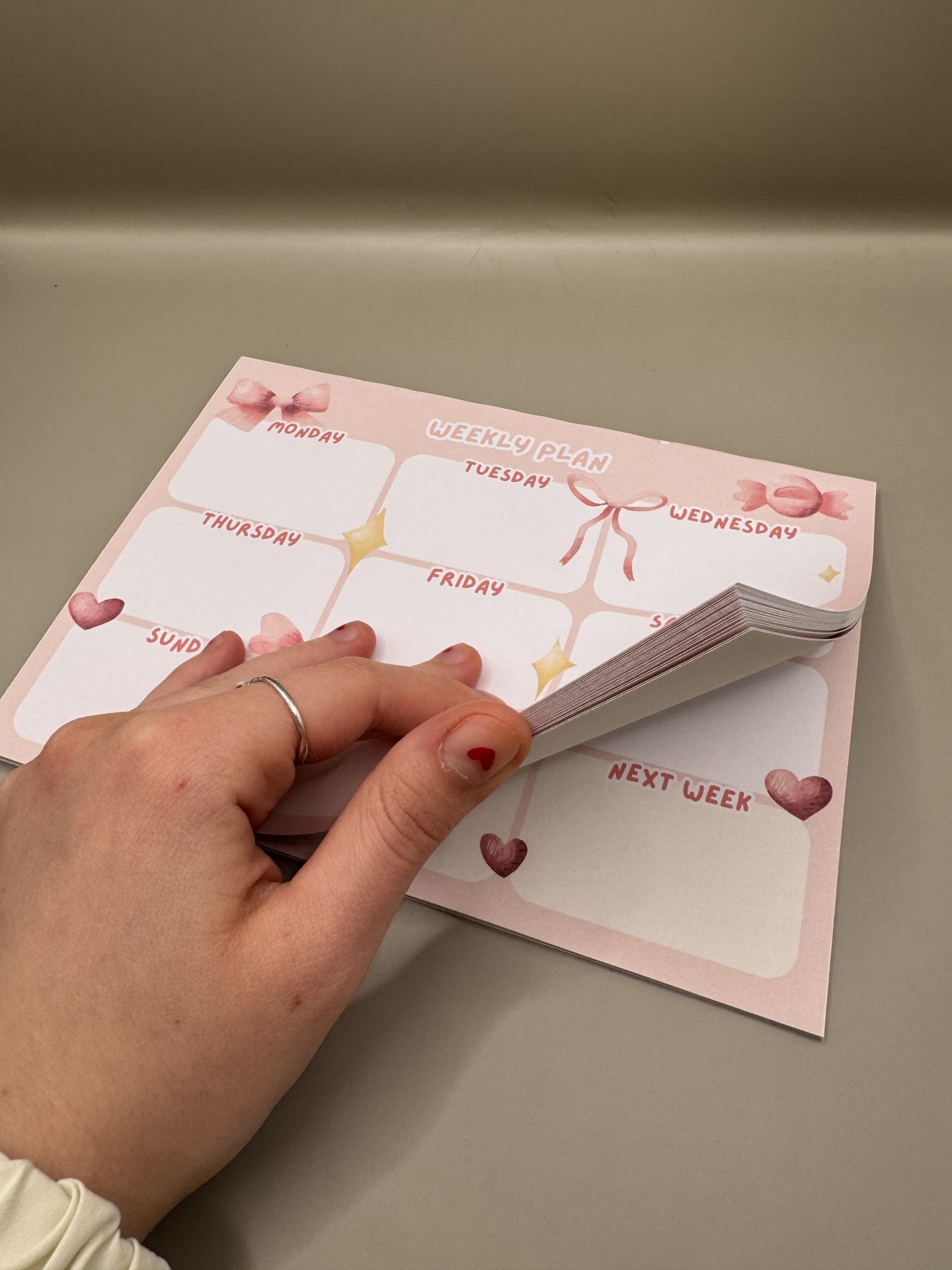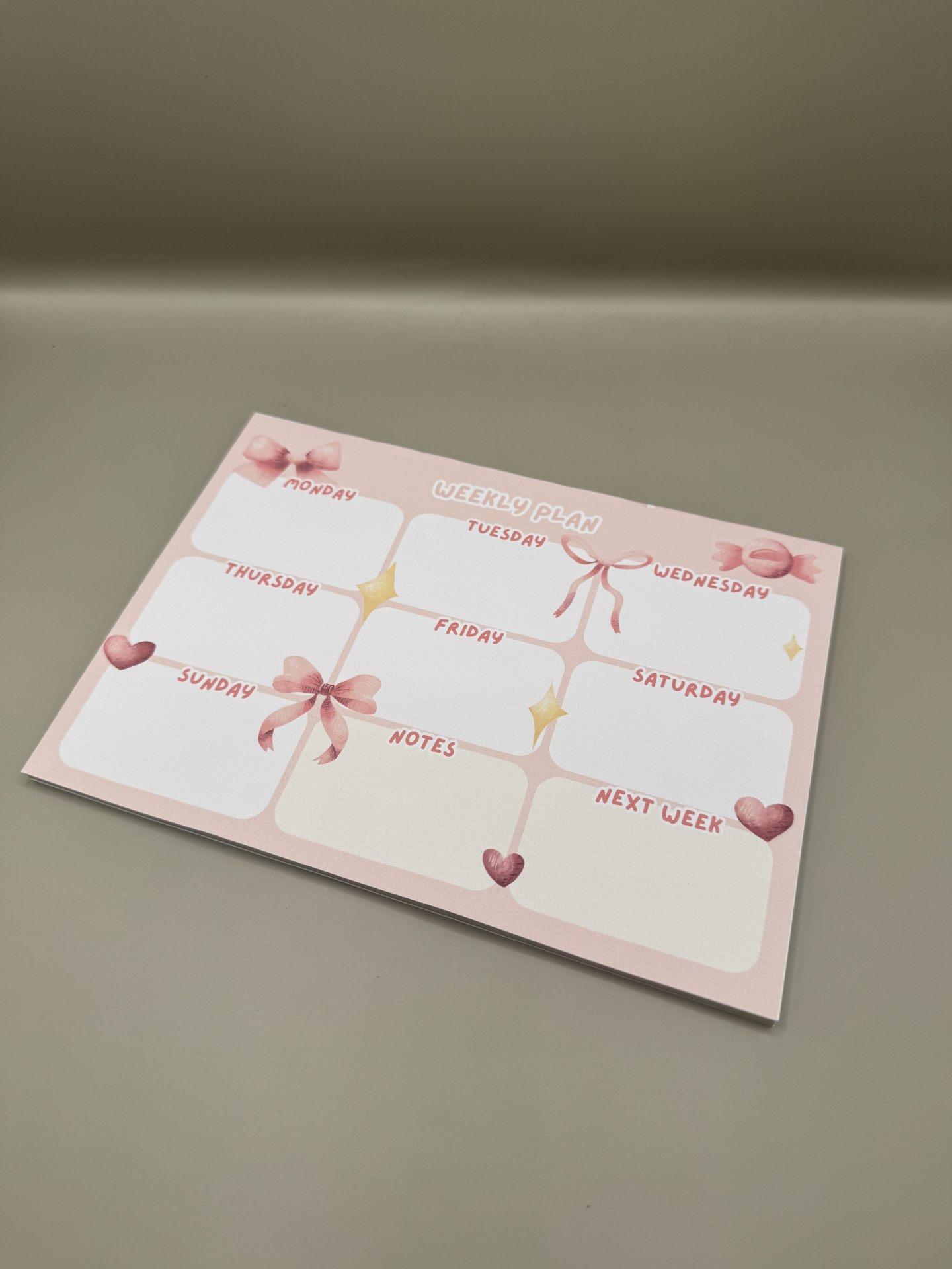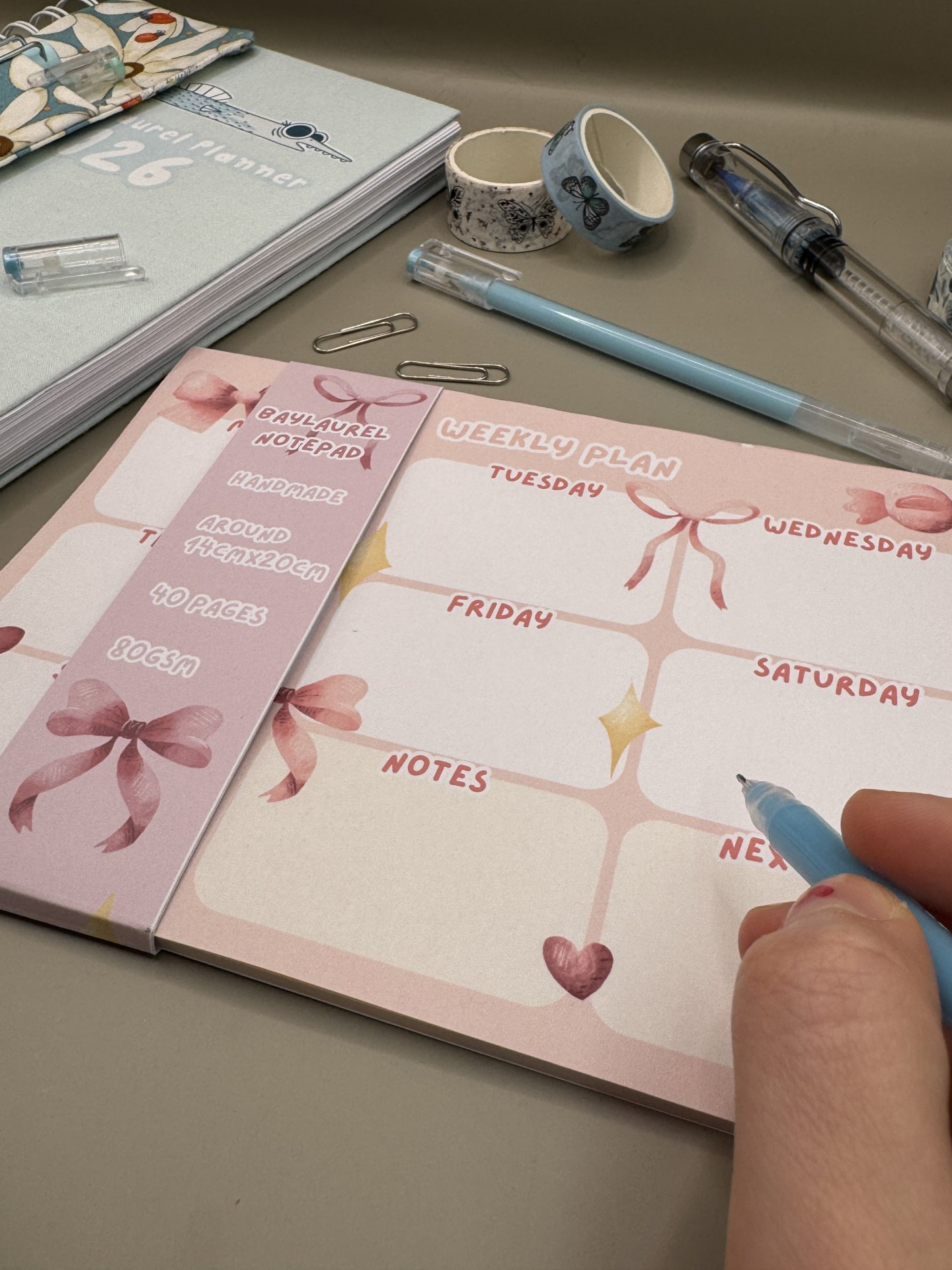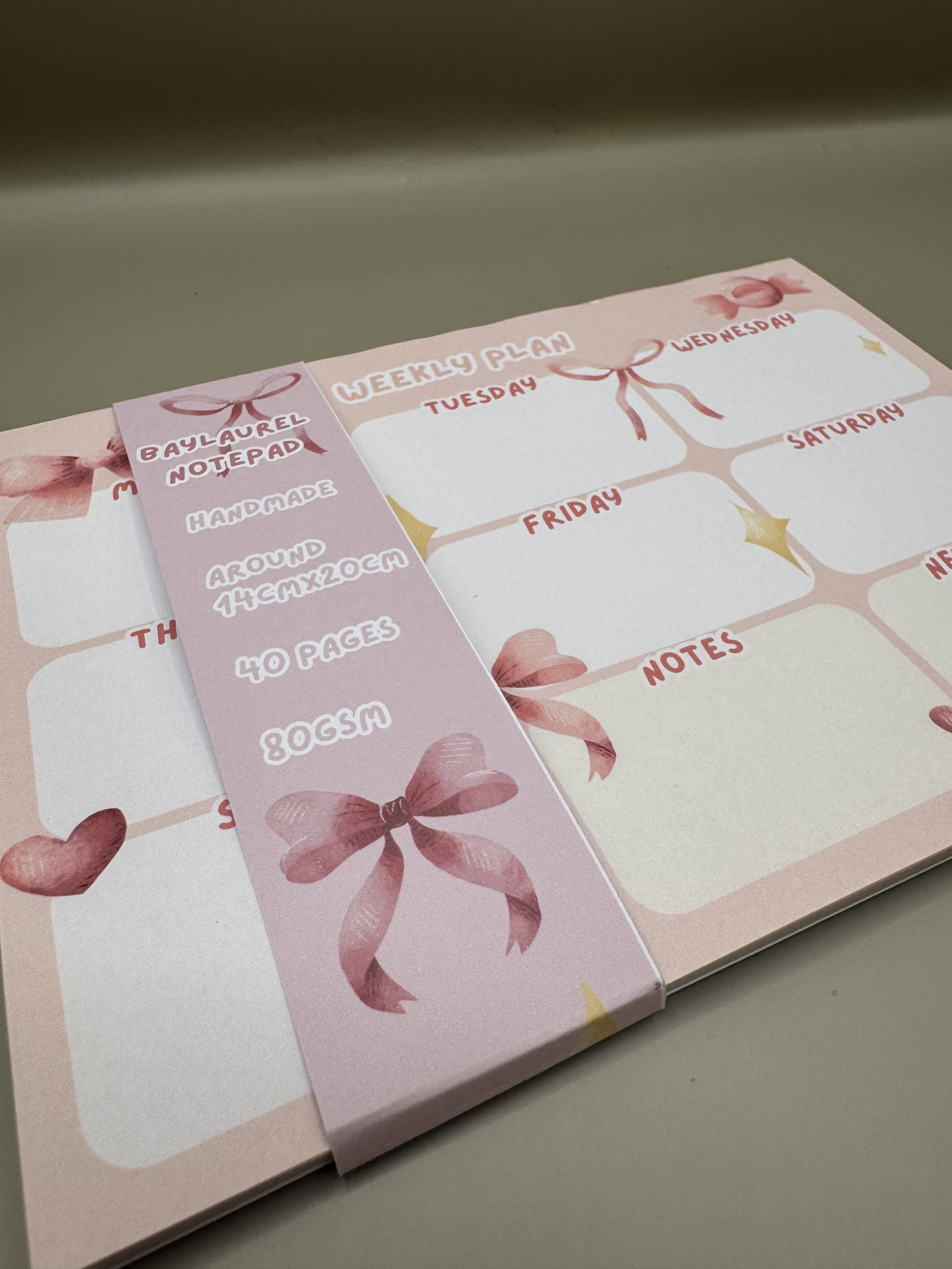 Handmade weekly planner with bow design.