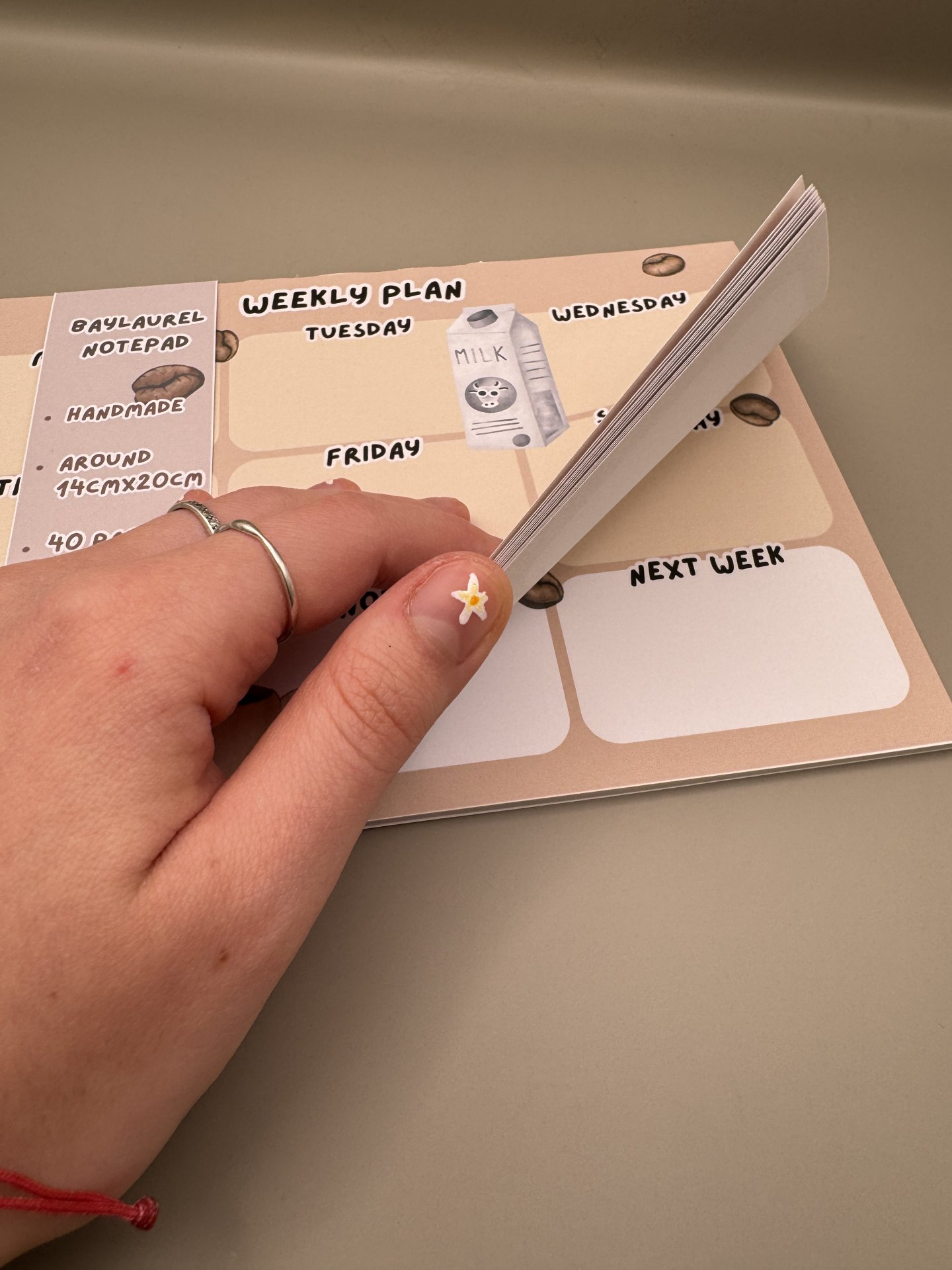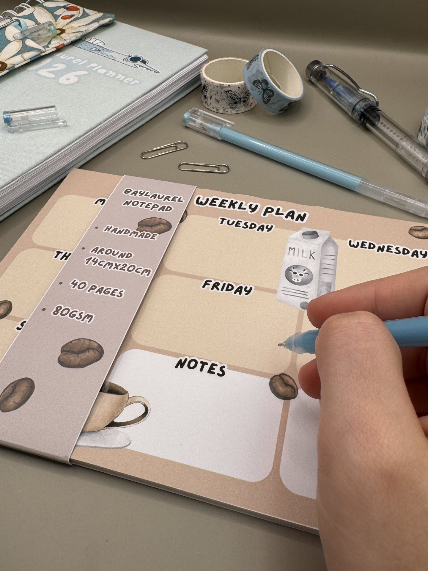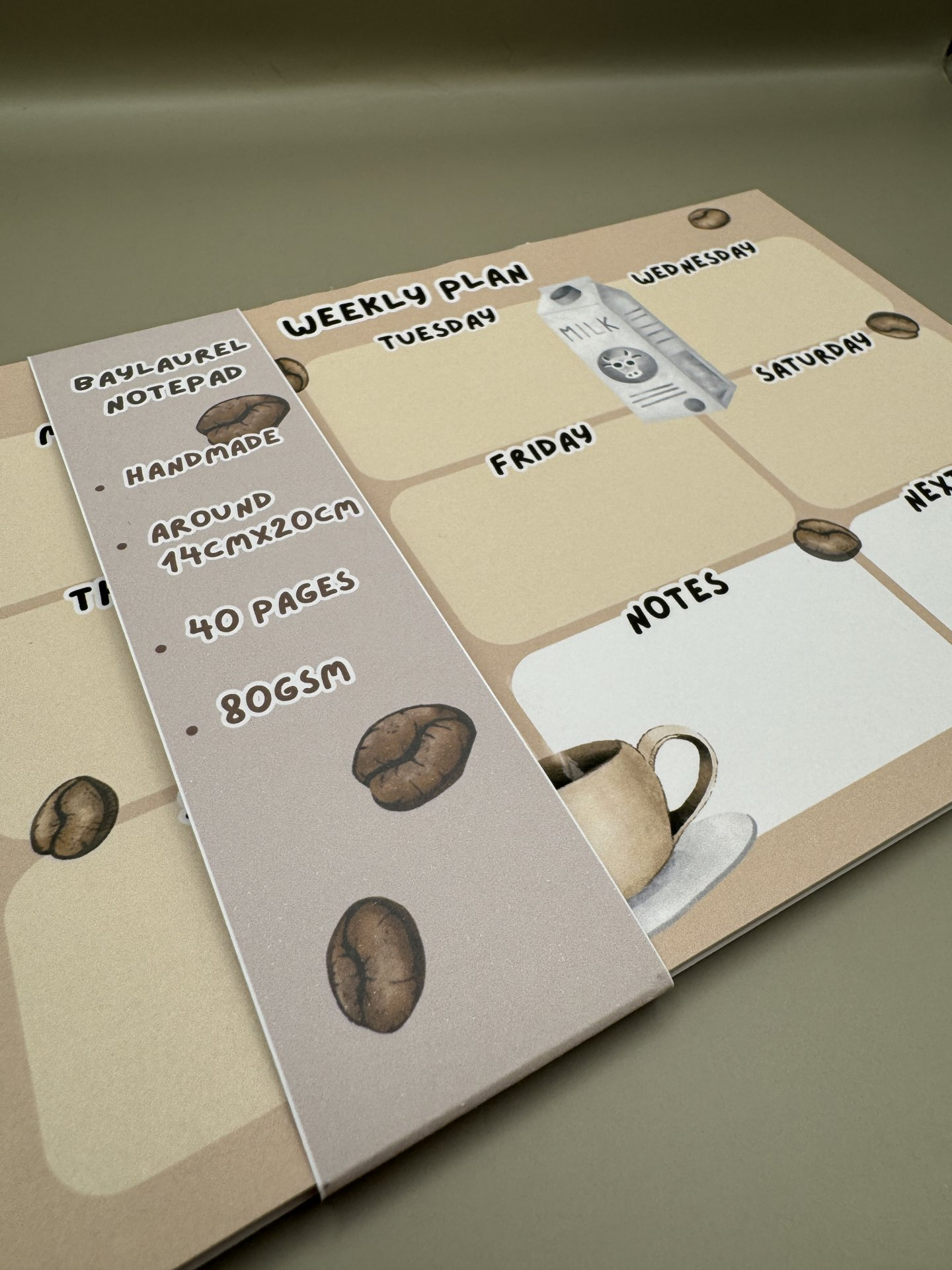 Handmade weekly planner with coffee and milk design.
