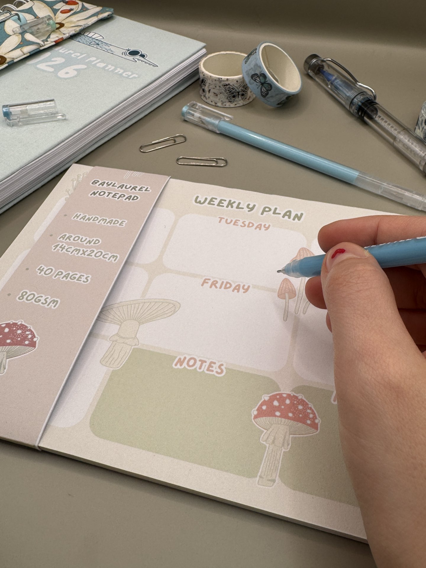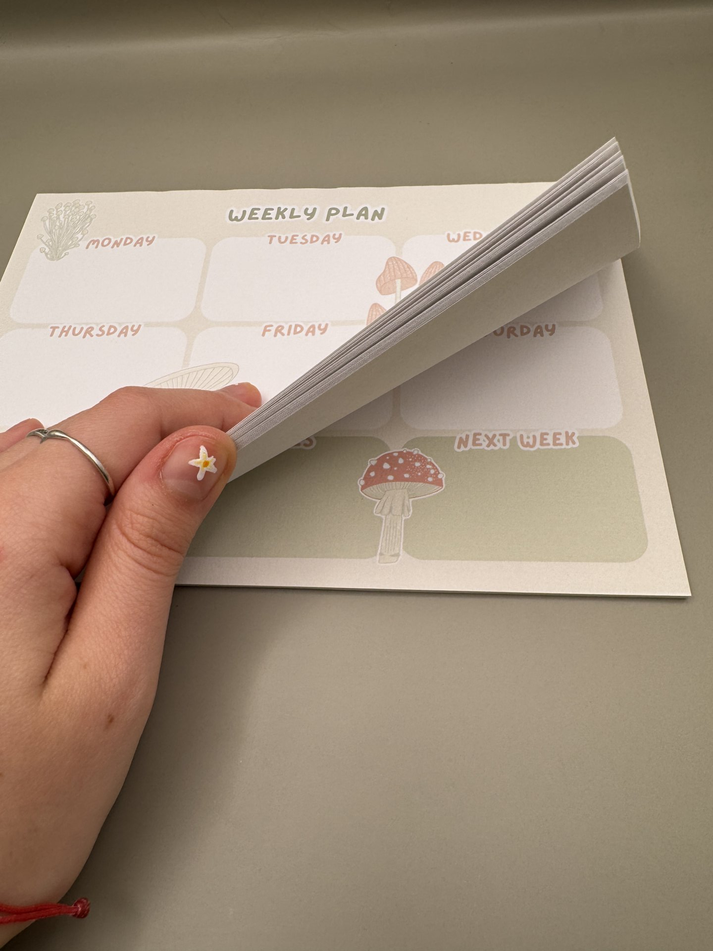Handmade weekly planner with mushroom design.