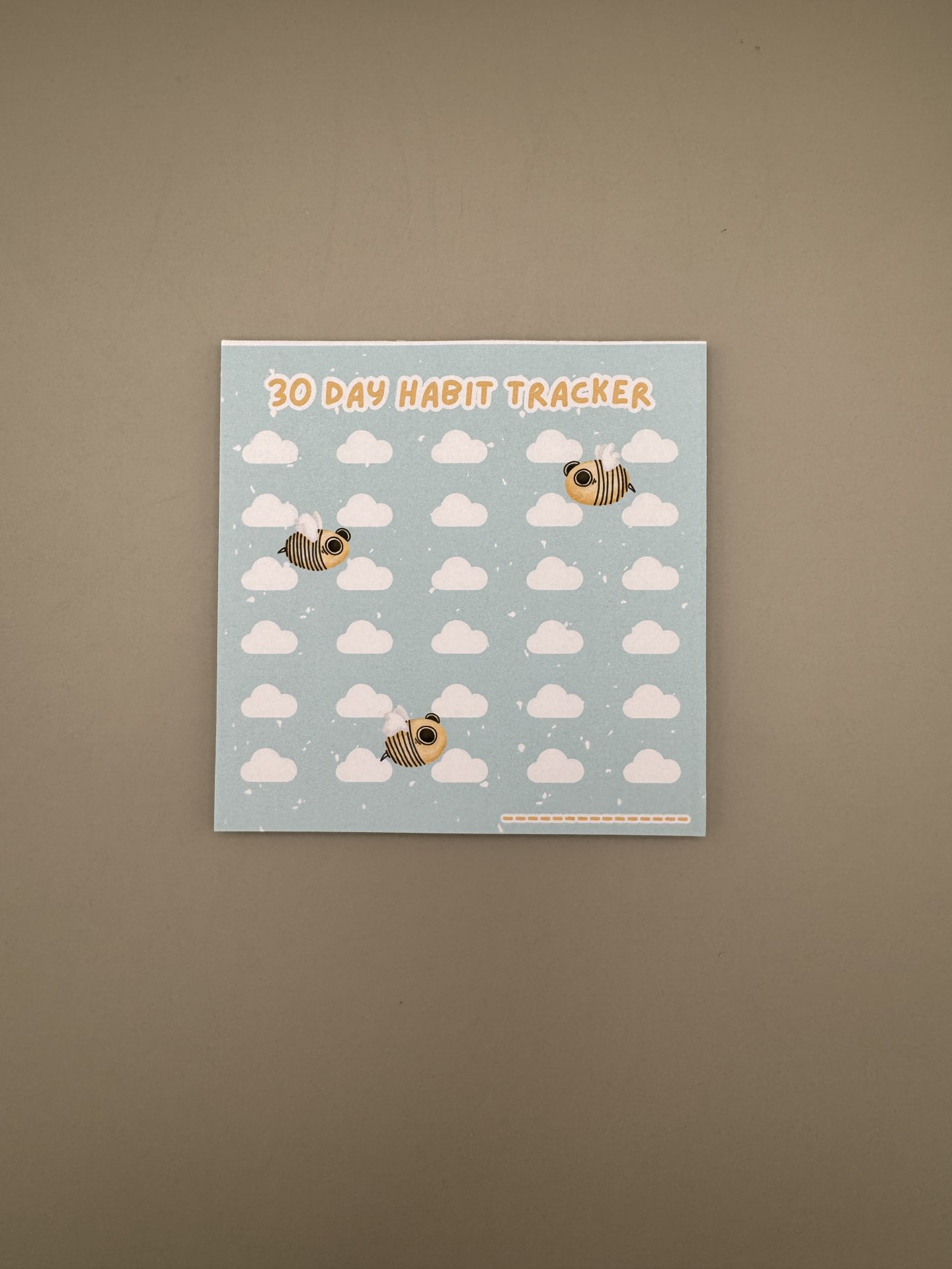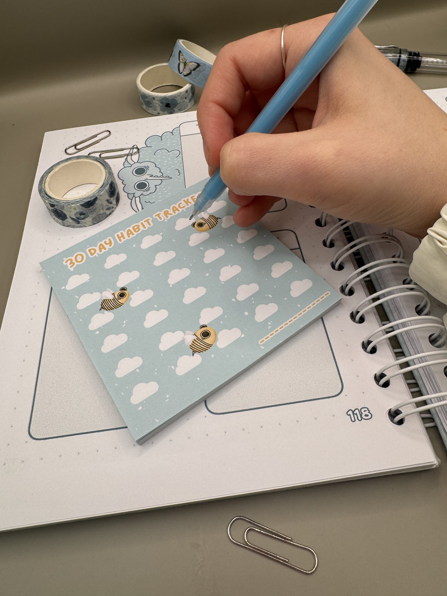 Notite lucrate manual, in stil de habit tracker cu nori si albinute.