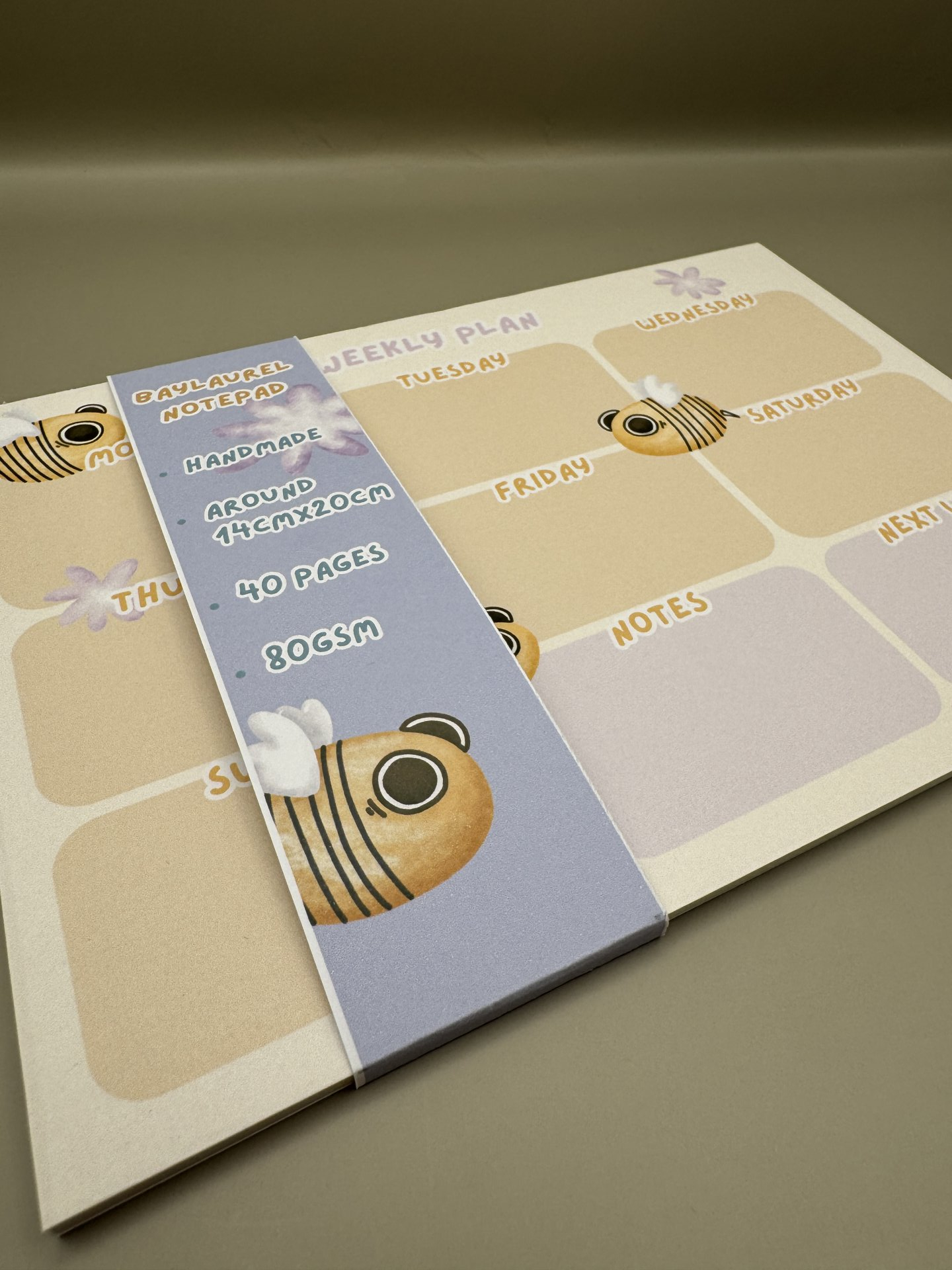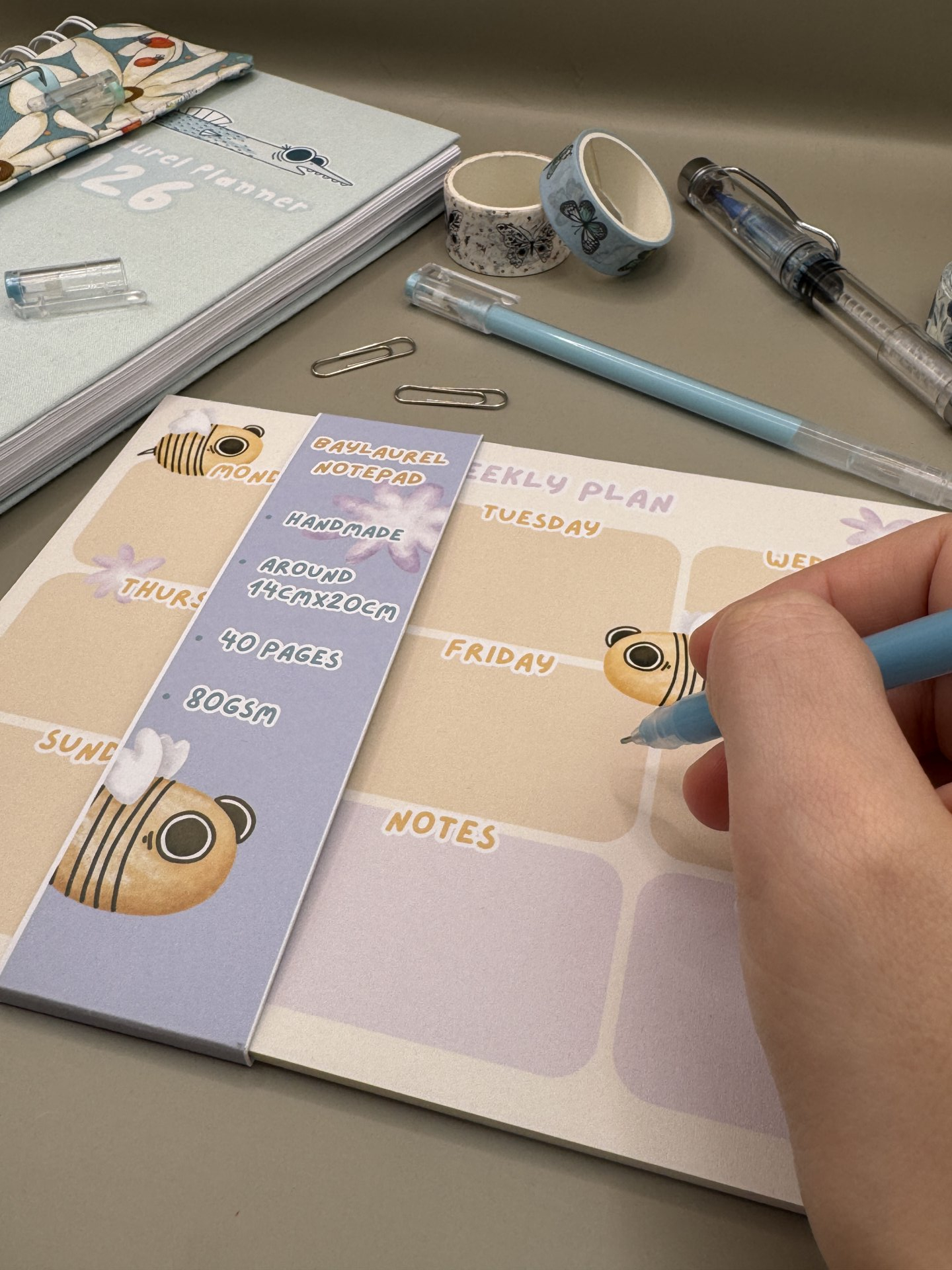 Notite lucrate manual, in stil de planner saptamanal cu model de albinuta.