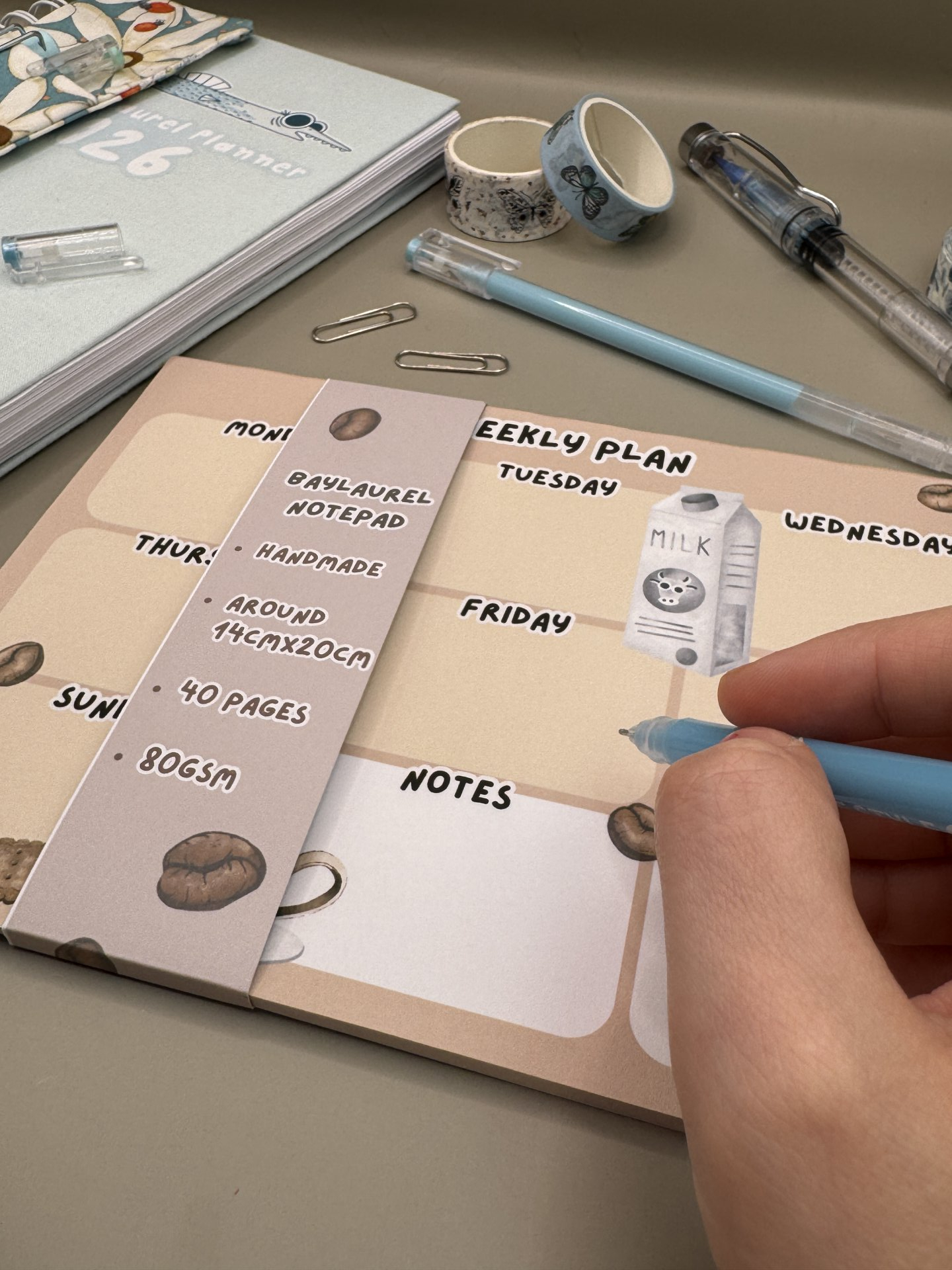 Notite lucrate manual, in stil de planner saptamanal cu model de cafea si lapte.