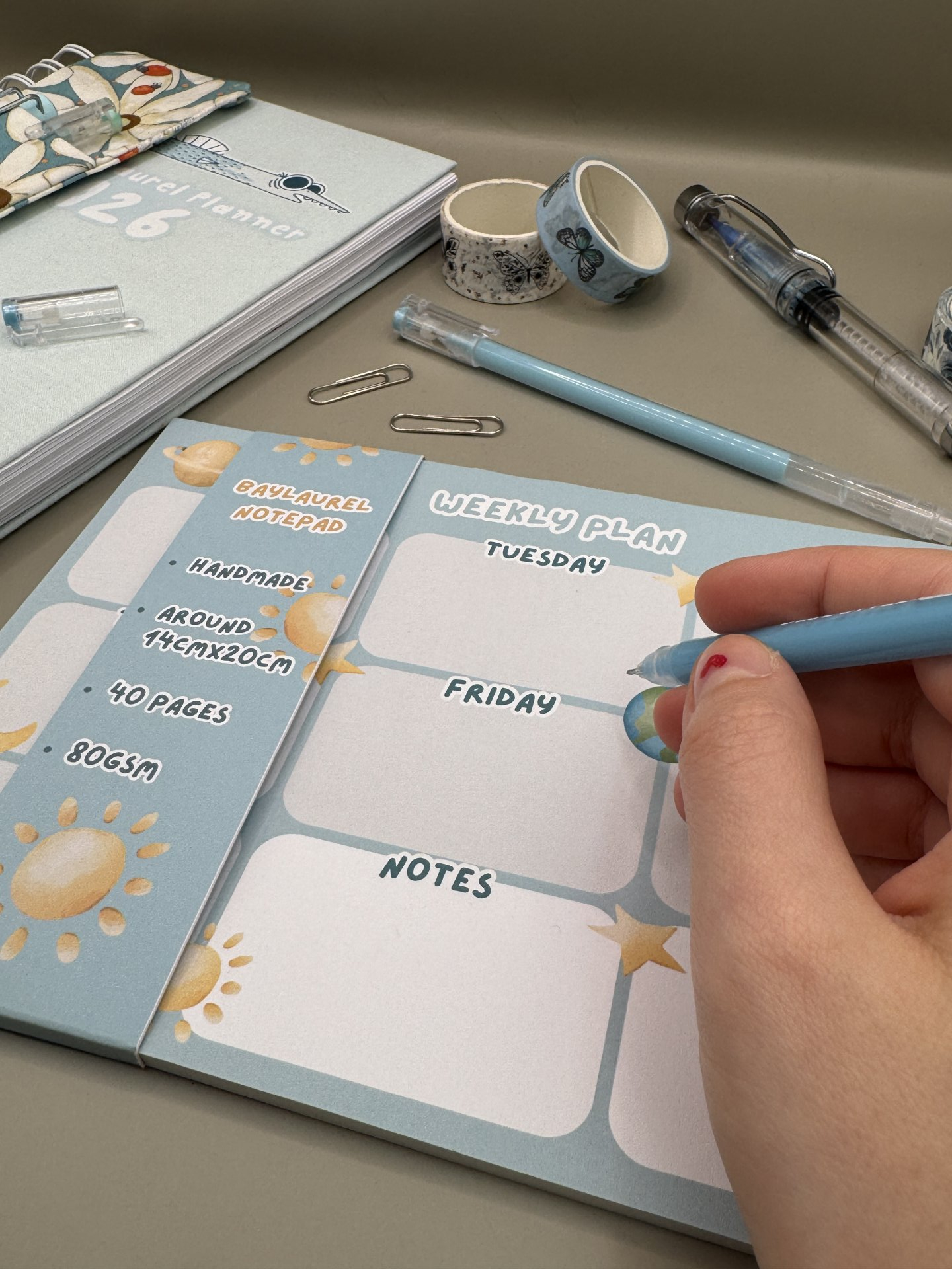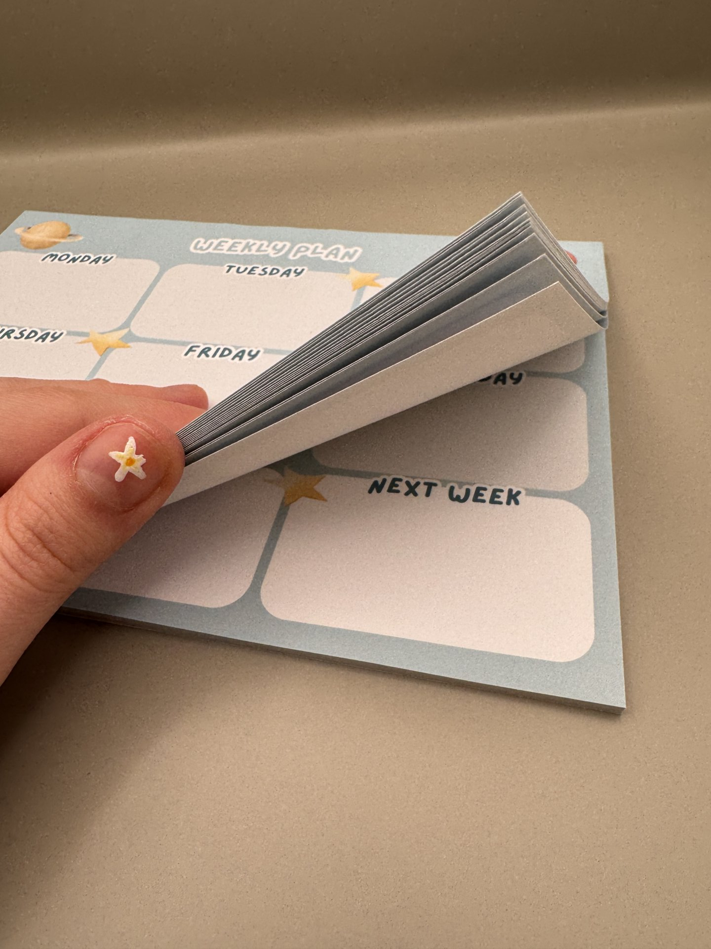 Notite lucrate manual, in stil de planner saptamanal cu model de planete.